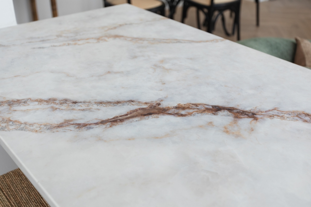 Marble’s veined patterns and soft sheen make it the ultimate statement piece. Its naturally cool surface is perfect for baking enthusiasts, and its timeless appeal suits both traditional and modern kitchens. However, marble is porous and delicate, prone to etching and scratching, so it requires regular sealing and gentle care.